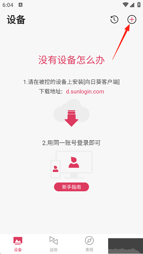 1、打开向日葵远程控制手机版,在首页点击右上角的+图标;