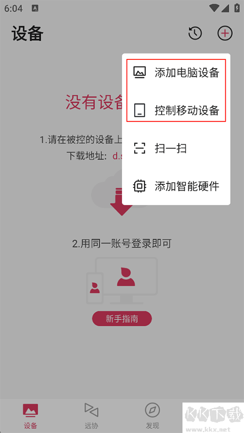 2、在弹出的功能列表中根据需求选择添加电脑设备或控制移动设备;
