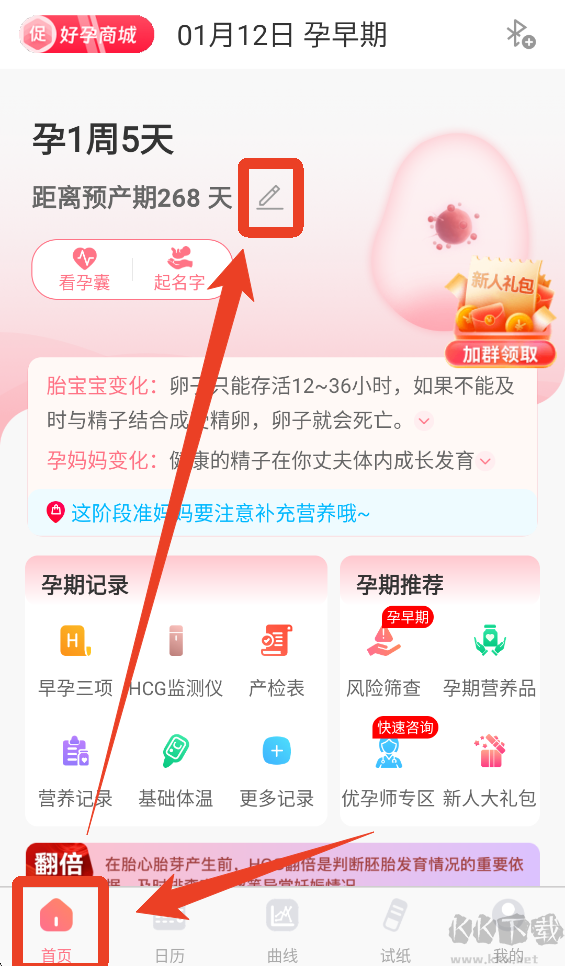 1、在孕期管理模式的【首页】点击预产期天数旁边的笔图标。