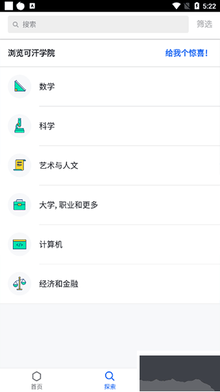 2、探索界面可以选择具体学习科目数学、科学、艺术与人文、计算机、经济和金融等