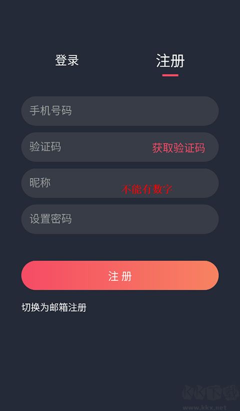 2、有账号密码直接登录即可,首次使用切换为“注册”,输入手机号、昵称以及密码。(注意:昵称里面不能有数字)